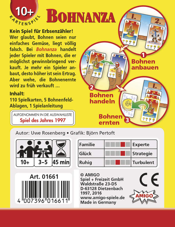Ich glaub‘, es hackt! Die Spieler bauen verschiedene Bohnensorten auf ihren Feldern an, um dieErnte möglichst profitabel zu verkaufen. Dabei ist es besonders wichtig,möglichst geschickt mit seinen Mitspielern zu handeln. Selbst verschenkenist erlaubt – und manchmal der beste Weg zum Sieg.Durch die Bohnenfeld-Ablagen und die Startspielerkarte wird dem Spielerein vereinfachter Einstieg in den Bohnenhandel ermöglicht!