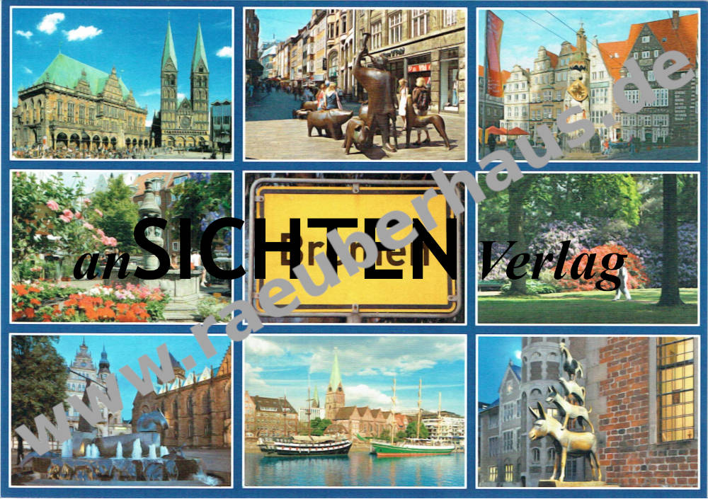 Postkarte: v.I.: Rathaus / Town hall (ab 1410, Weltkulturerbe / UNESCO World Heritage site) und St.Petri-Dom / Cathedral (1043) • Skulptur der Sögegruppe / swineherd with dog and sows (1974, Peter Lehmann) • Der Roland / Statue of Roland (1404, Weltkulturerbe / UNESCO World Heritage site) • Blumenmarkt / Flowermarket • Rhododendronpark • Neptunbrunnen / Fountain of Neptun (1991,W.Otto) • Schlachte und Martinianleger I Jetty • Bremer Stadtmusikanten / Town Musicans (1952,G.Marcks)