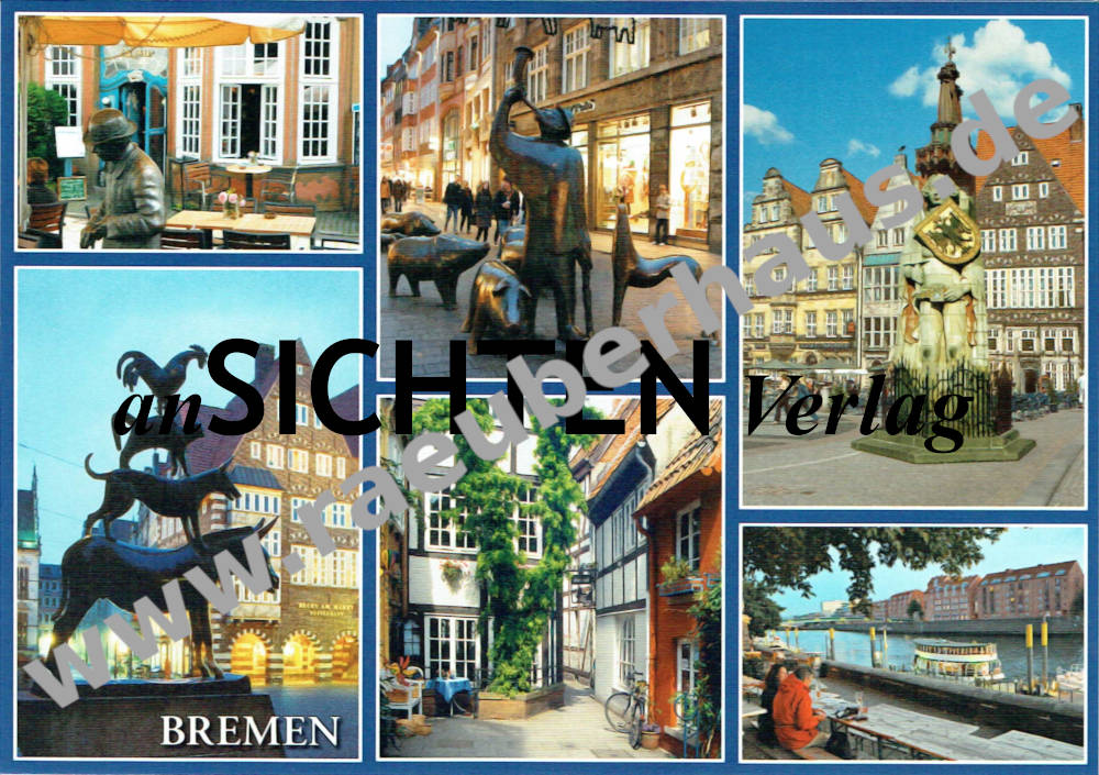 Postkarte: v.l.: Bronzeplastik „Heini Holtenbeen" im Schnoor / Schnoor Quarter • Skulptur der Sögegruppe / Swineherd with dog and sows (1974, P.Lehmann) • Der Roland (1404, Weltkulturerbe) / Statue of Roland (1404, UNESCO World Heritage Site) • Bremer Stadtmusikanten / Town Musicans (1952,G.Marcks) • Bürger- und Handwerkerhäuser (16.-18.Jh.) im Schnoor / Schnoor Quarter • Schlachte und Martinianleger /Jetty