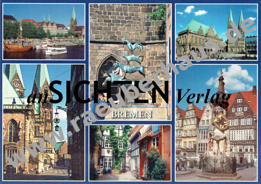 Postkarte v.l.: Die Hanse Kogge „Roland von Bremen" war ein Handelsschiff • Bremer Stadtmusikanten / Town Musicans (G.Marcks, 1952) • Rathaus / Town Hall (1410), St. Petri-Dom / Cathedral (1043,13.1h.), Haus der Bürgerschaft / House Of Parliament (1963-66) • Domansicht von der Obernstraße • Bürger- und Handwerkerhäuser (16.-18.Jh.) im Schnoor / Schnoor Quarter • Roland (1404, Weltkulturerbe)