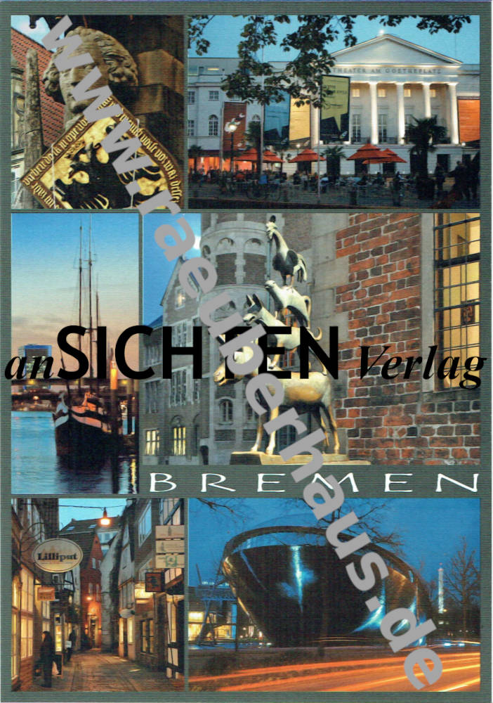 Postkarte: v.l.: Der Roland (1404,Weltkulturerbe) / Statue of Roland (World Heritage site) • Theater am Goetheplatz (1912-13) • Blick von der Schlachte zum Weser-Tower (2010) / View from the Schlachte to Weser-Tower • Die Bremer Stadtmusikanten (G. Marcks, 1952) / Town Musicans • Burger- und Handwerkerhäuser (16.-18.Jh.) im Schnoor / Schnoor Quarter • Das Universum (2000) / Building of Universum