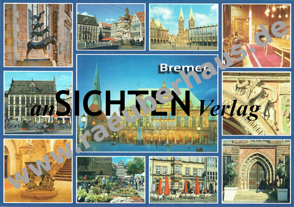 Postkarte: Stadtmusikanten / Town Musicans • Der Roland / Statue of Roland in front of old patricians houses • St.-Petri-Dom / Cathedral, Parlamentsgebäude / City Parliament • Güldenkammer im Rathaus • der Schütting / Guild Hall • Rathaus / Town Hall (Weltkulturerbe / UNESCO World Heritage Site) • „Gluckhenne" in der Rathausfassade • Taufbecken von 1220 im Dom / inside Cathedral Blumenmarkt / Flower Market • Bürgerhäuser / Old patricians houses am Marktplatz • Herolde am Rathaus
