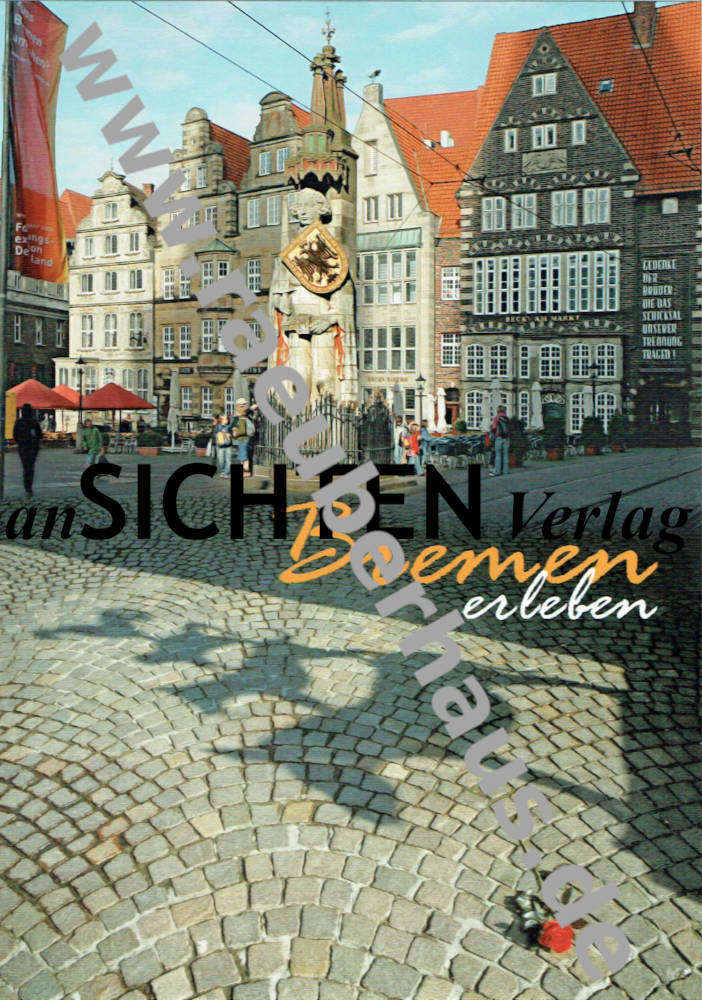 Postkarte: Der Roland (1404, Weltkulturerbe) vor den Patritzierhäusern von 1595 / Statue of Roland (1404, UNESCO World Heritage site) in front of old Patricians Houses • Schatten von den Märchenfiguren „Stadtmusikanten" / Shadow of the fairy tale figures „Town Musicans"
