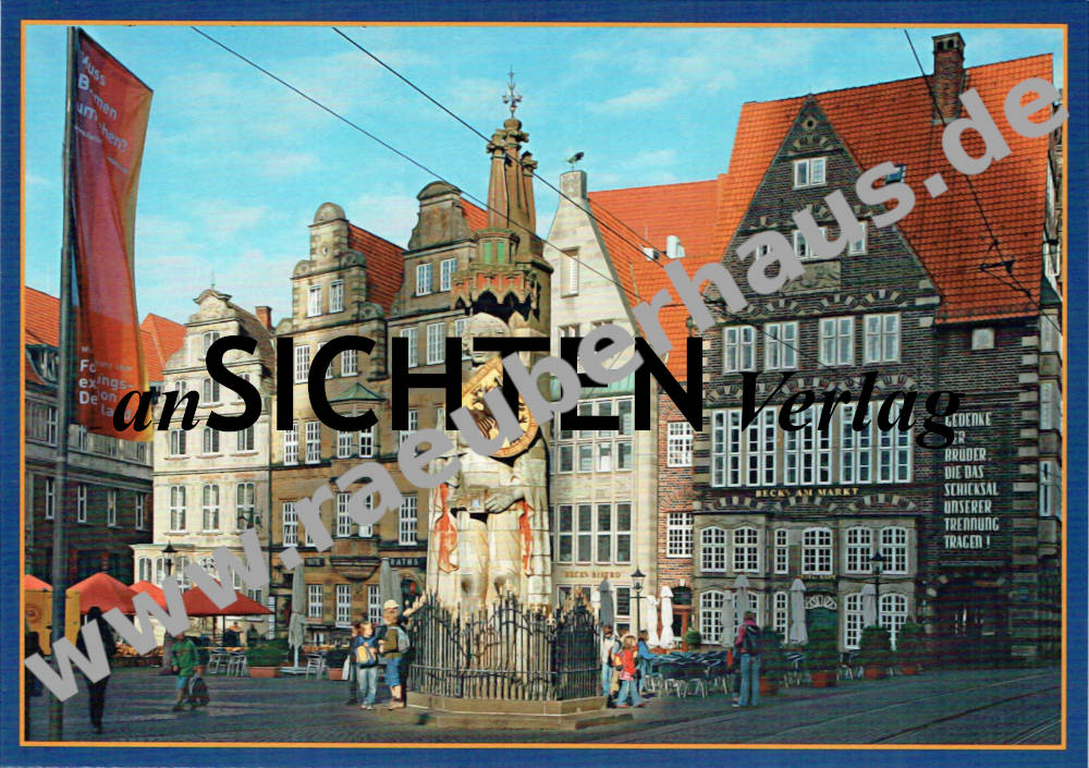 Postkarte: Der Roland war eine Symbolfigur für die „Freiheiten" bzw. die Rechte der Bürgerstadt gegenüber dem Klerus im Dom. Nachdem eine hölzerne Rolandstatue von 1366 im Auftrag des Erzbischofs verbranntwarden war, entstand 1404 der steinerne Roland (10,21m hoch). Statue of Roland (1404) in front of old Patrician Houses (1595-1755).