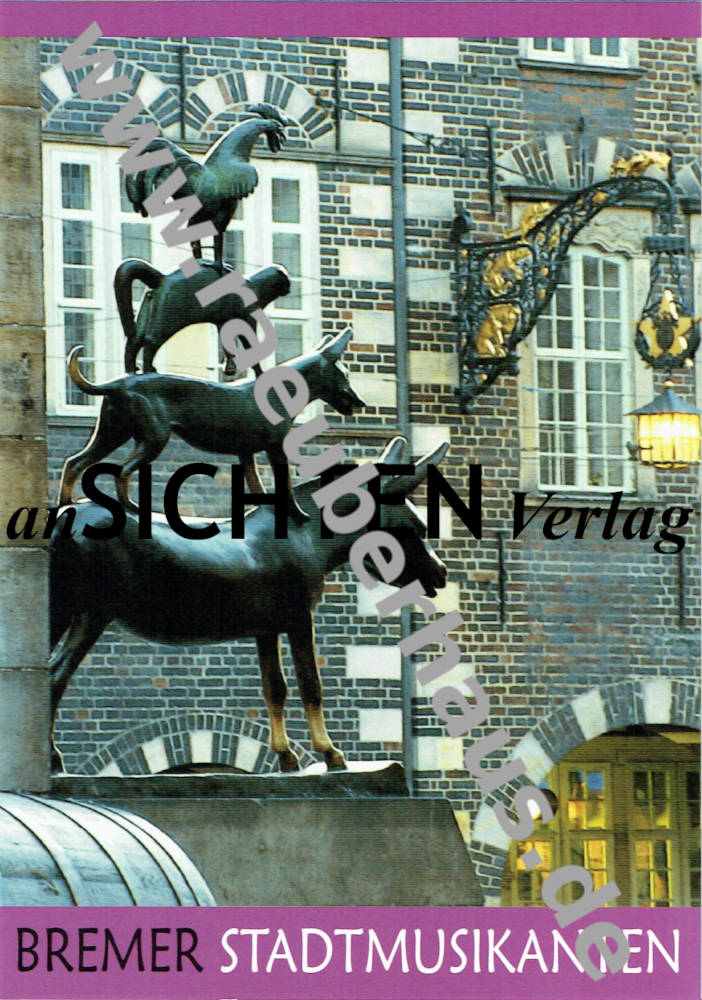 Postkarte: Die Bronzeplastik der „Bremer Stadtmusikanten" / „Town Musicans"wurde 1952 von Gerhard Marcks nach dem gleichnamigen Märchen geschaffen. Es ist die Geschichte von Esel, Hund, Katze und Hahn, welche ihren Besitzern entflohen und als Musikanten gen Bremen zogen.