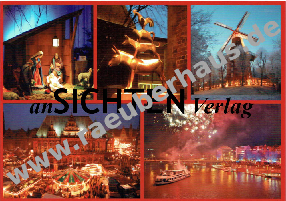Postkarte: Weihnachten / Christmas in der Hansestadt Bremen v.l.: Krippe in der St.Johanniskirche im Schnoor • Bremer Stadtmusikanten / Town Musicans • Mühle / Windmill in den Wallanlagen • Weihnachtsmarkt am Rathaus /Christmas Market in front of Town Hall • Schlachtezauber / Schlachte Magic in weihnachtlich maritimen Ambiente