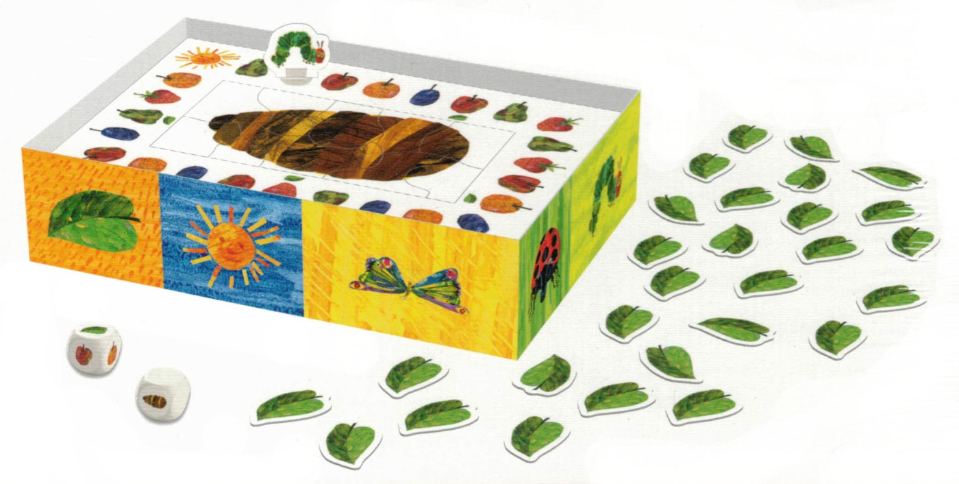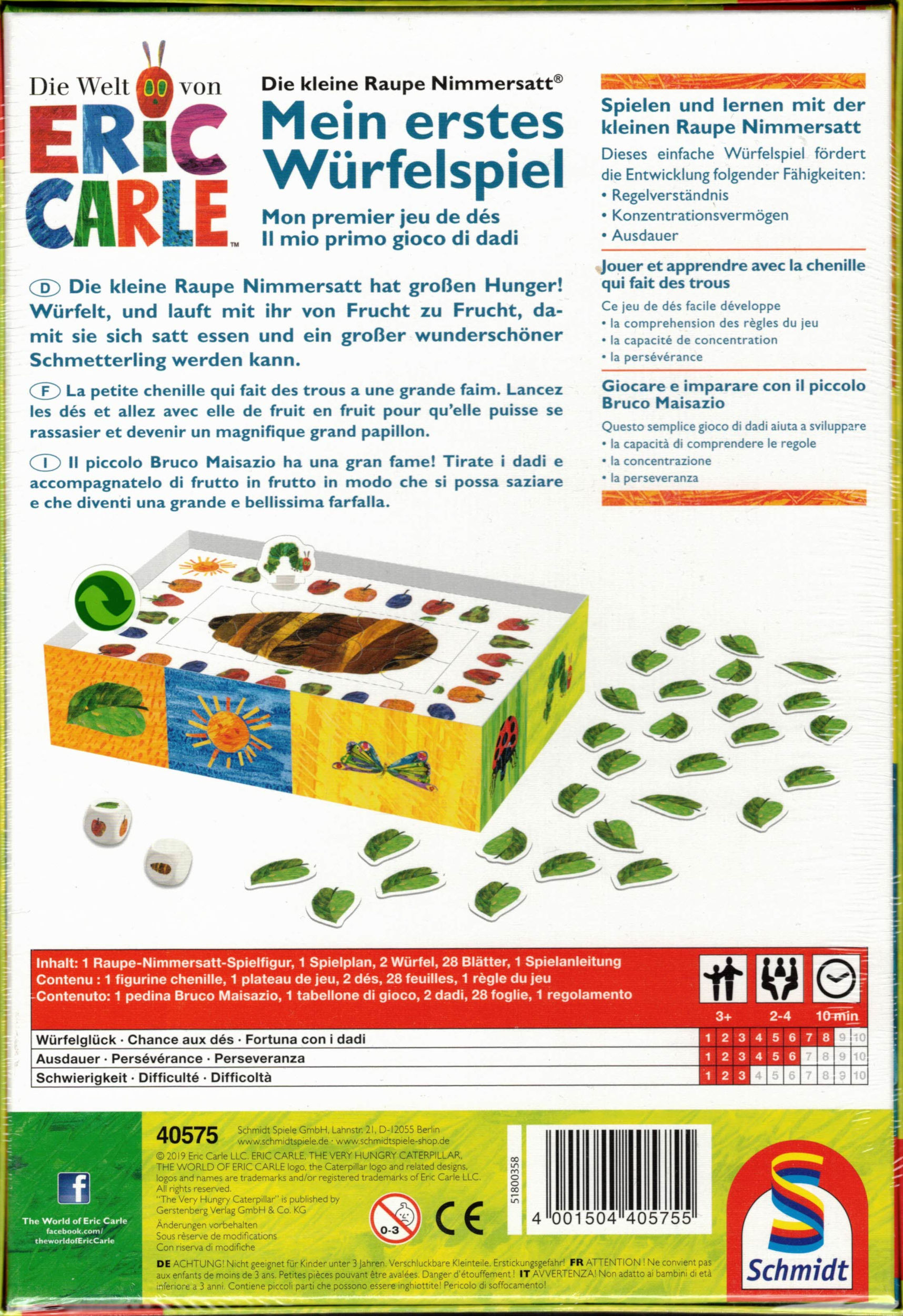 Die kleine Raupe Nimmersatt hat großen Hunger! Würfelt, und lauft mit ihr von Frucht zu Frucht, damit sie sich satt essen und ein großer wunderschöner Schmetterling werden kann. Spielen und lernen mit der kleinen Raupe Nimmersatt: Dieses einfache Würfelspiel fördert die Entwicklung von Regelverständnis und Konzentrationsvermögen.