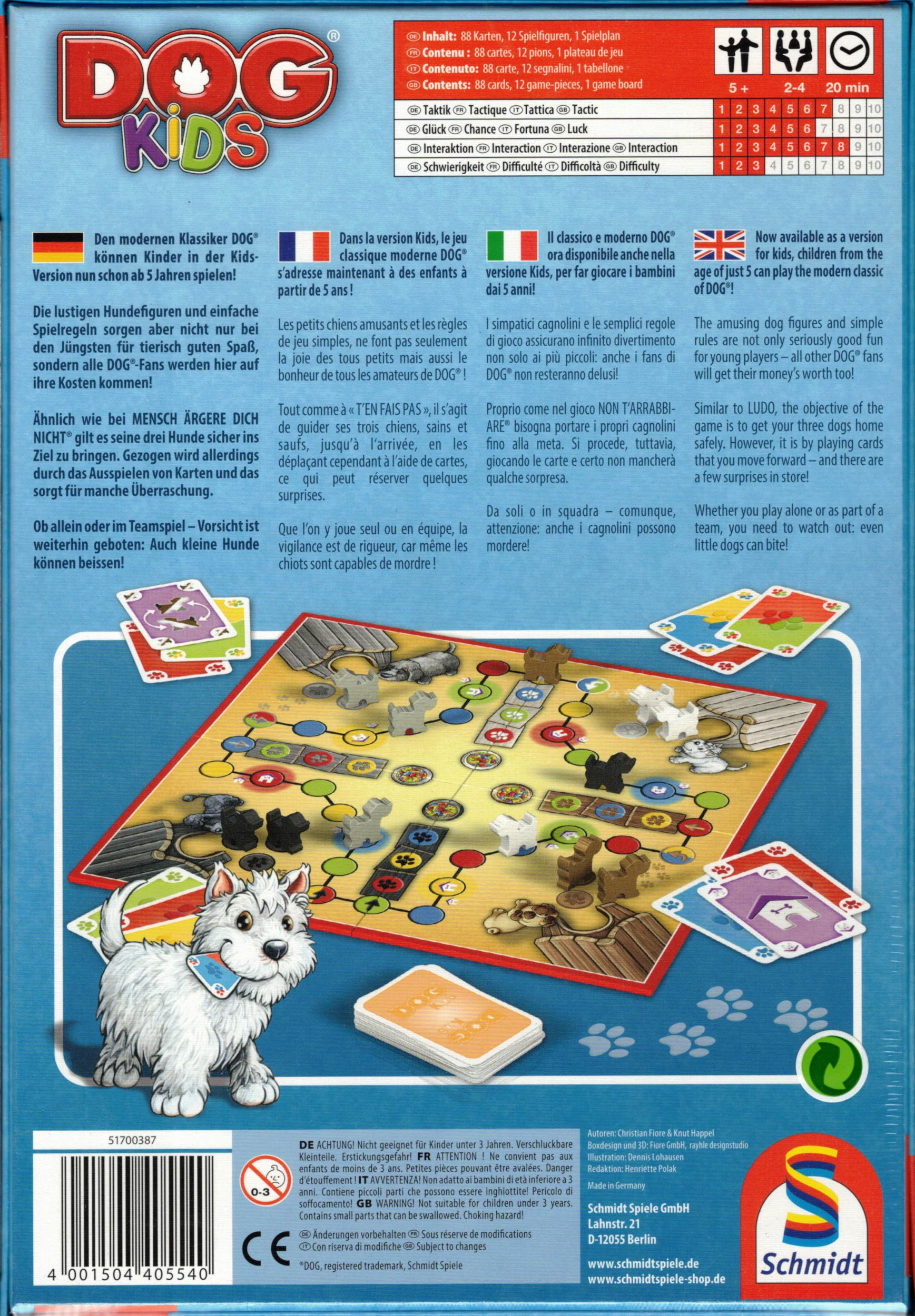 Den beliebten Klassiker DOG® können mit dieser kindgerechten Farbversion Kinder bereits ab 5 Jahren spielen. Ähnlich wie bei MENSCH ÄRGERE DICH NICHT® muss man seine drei Hunde sicher ins Ziel bringen. Gespielt wird allerdings mit Karten und diese sorgen für manche Überraschung und einen hohen Wiederspielreiz. Aber Vorsicht ist auch hier geboten: Auch kleine Hunde können manchmal beissen!