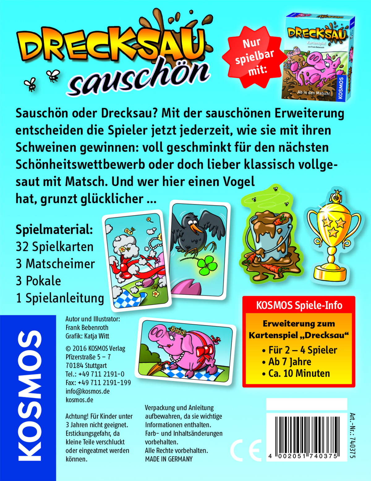 Sauschön oder Matsch – nur eine Schweineparade kann gewinnen. Im saustarken Erweiterungsset können die Spieler jederzeit entscheiden, wie sie ihre Schweine zum Sieg führen. Voll geschminkt und durchgestylt für den nächsten Schönheitswettbewerb oder doch lieber klassisch vollgesaut in der Matschsuhle. Wer hier einen Vogel hat, kommt durchaus glücklicher ans Ziel. Sauschön – die saustärkste Erweiterung, nur spielbar mit dem Drecksau-Kartenspiel!