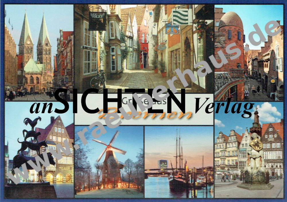 Postkarte: v.1.: Der St. Petri-Dom / Cathedral (1043, 13 Jh.) • Bürger- und Handwerkerhäuser (16 —18. Jh.) im Schnoor / Schnoor Quarter • Die Böttcherstraße (1923-31) • Die Bremer Stadtmusikanten / Town Musicans (1952,G.Marcks) • Mühle / Windmill in den Wallanlagen • Blick von der Schlachte zum Wesertower (2010) in der Überseestadt in der Überseestadt • Roland (1404, Weltkulturerbe) / Statue of Roland (UNESCO World Heritage site)