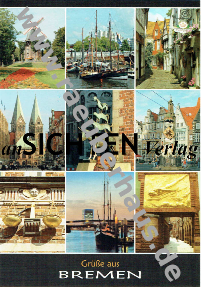 Postkarte: v.l.: Die Mühle / Windmill in den Wallanlagen (1604) • Vegesacker Hafen (1622, ältester Hafen Deutschlands)/Vegesack harbour • Bürger- und Handwerkerhäuser (16.-18.Jh.) im Schnoor / Schnoor Quarter • St.Petri-Dom / Cathedral (1043) • Bremer Stadtmusikanten / Town Musicans (1952,G.Marcks) • Roland / Statue of Roland (1404) • Stadtwaage (1587/88) • Die Schlachte und Martinianleger / Martini Quay • „Lichtbringer" / Bringer of Light (Hoetger,1936)