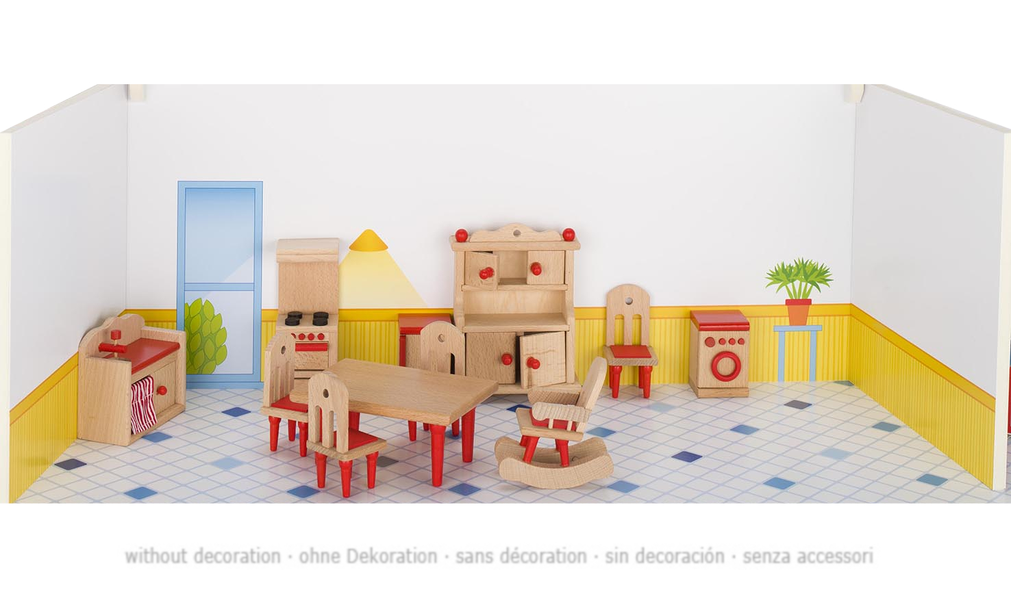 Klassische Puppenmöbel Küche 11 Teile im gemütlichen Bauernhausstil. Passend zu allen goki-Puppenhäusern. Schrank H= 14 cm