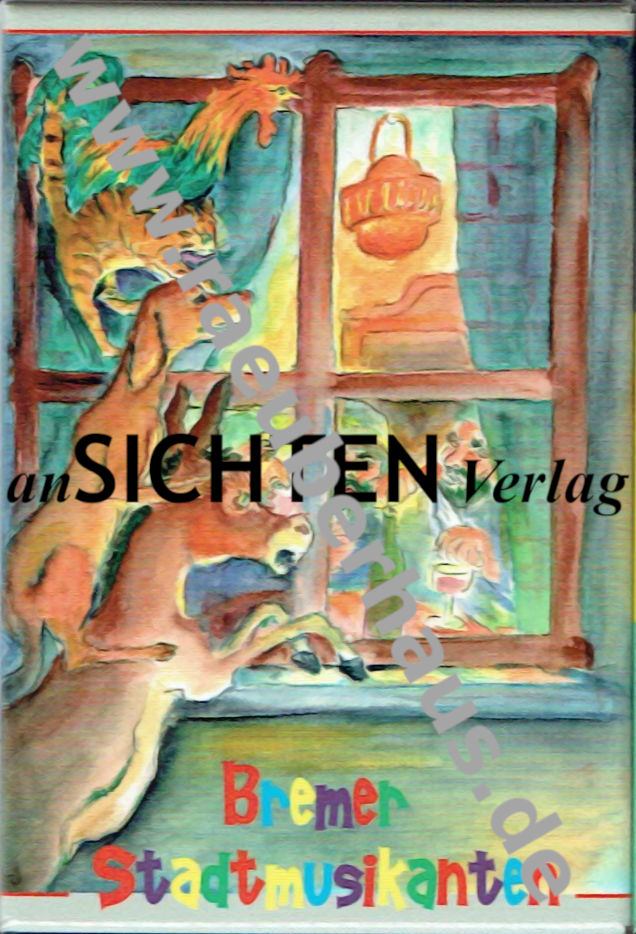 Kühlschrankmagnet: Szene aus dem Märchen „Die Bremer Stadtmusikanten" von den Gebrüdern Grimm. Szene from the fairy story of the „Town Musicans".