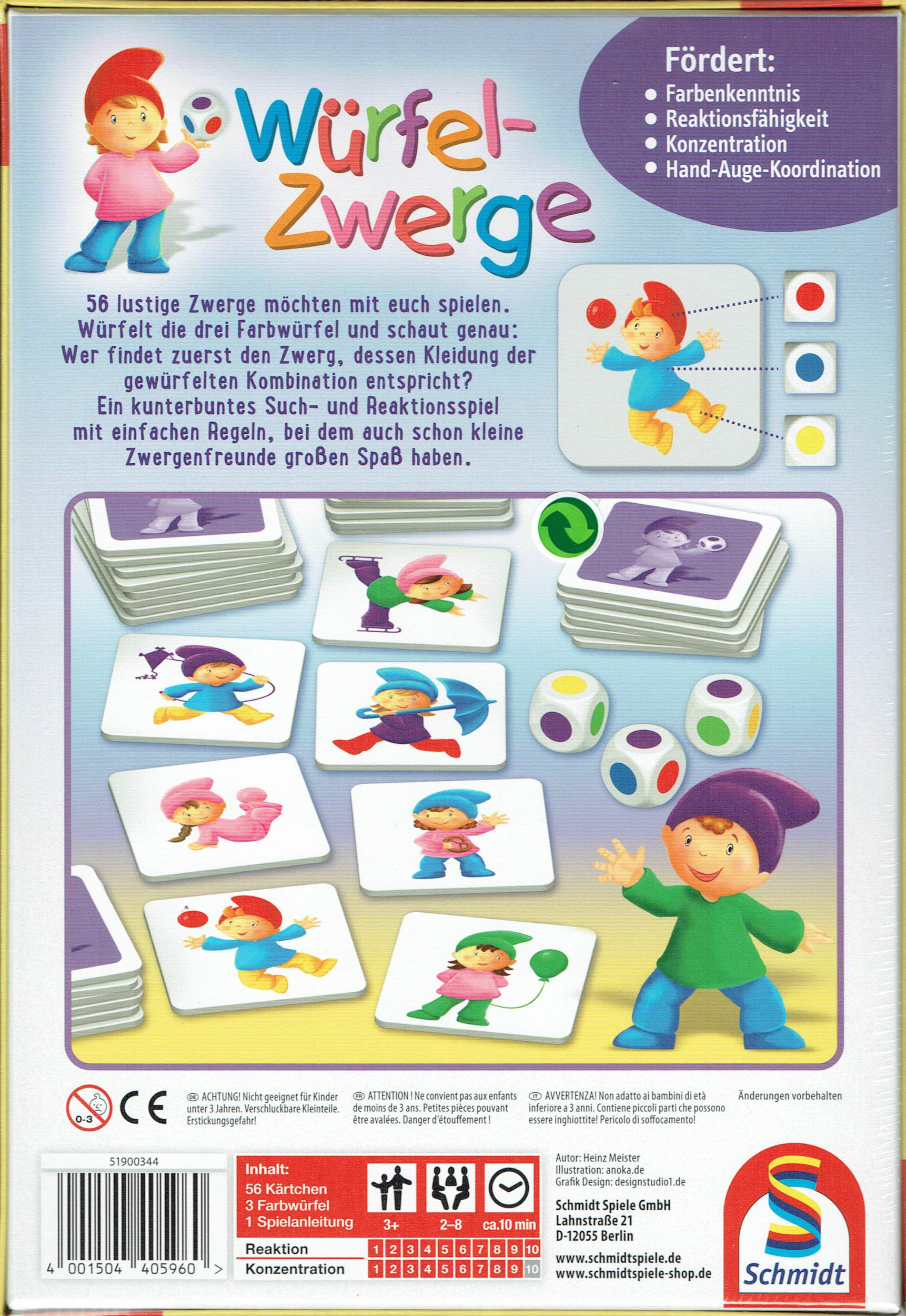 56 lustige Zwerge möchten mit euch spielen. Würfelt die drei Farbwürfel und schaut genau: Wer findet zuerst den Zwerg, dessen Kleidung der gewürfelten Kombination entspricht? Ein kunterbuntes Such-und Reaktionsspiel mit einfachen Regeln, bei dem auch schon kleine Zwergenfreunde großen Spaß haben.